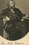 [CP russe, portrait de Michel Bakounine en 1863 par Sergeij Lewitzki. A noter la disparition du dossier du fauteuil sur cette photo.]