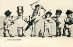 [CP satirique allemande. Dessin d’un bourgeois menacés par une bande d’anarchistes armés de gourdin, pistolet, flacon de pétrol ?, flacon d’huile de ricin ?, ampoule de nitro-glycérine, et bombe de dynamite. Symbolique de la cigogne non élucidé.]