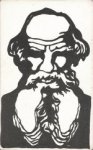 [CP autrichienne ludique éditée par l’Association de protection de l’enfance, portrait stylisé du Comte Léon Tolstoi. Si l’on découpe les parties blanches de la carte on peut en plaçant une lumière à l’arrière projeter le portrait de Tolstoi sur un mur.]
