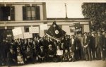 [CP photo, groupe de manifestants, grévistes cheminots (1910 ou 1920 ?) devant la gare de Ste Gauburge (Orne). Drapeau, pancartes et journal "La Voix du Peuple" (organe de la C.G.T).]