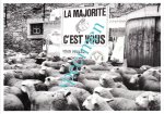 CP commerciale, photo de René Maltete, troupeau de moutons devant une affiche de racolage électoral vantant la Majorité. Satire des élections avec la symbolique du mouton.]