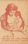 [CP des éditions de " L’Idée Libre " de Lorulot. Dessin de Granjouan, une mère et son bébé se posant une question sur le devenir de son enfant au service des militaires.]