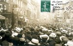 [ CP photo, vue de la foule autour du corbillard d’Henri Cler, militant anarchiste mort le 21 juin 1910, à Paris, victime des violences policières lors des grèves dans l’ameublement, faubourg St-Antoine à Paris. Présence de drapeaux et de pancartes (à noter que ses funérailles donneront lieu à des scènes d’émeutes).]