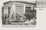 A noter la surimpression d’un tampon "Grèce Thessalonique" et un masque sur le texte turc, montrant que cette carte a été recyclée après le rattachement de Salonique à la Grèce en 1912.]Le Magasin du crime et les recherches après la Catastrophe du 29 Avril 1903 dans le Tunnel souterrain diabolique creusé devant la Banque Imp. Ottomane. 224. Editeur G. Bader, Salonique ΘΕΣΣΑΛΟΝΙKΗ ΕΛΛΑΣ