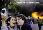 WELCOME TO BARCELONA au verso : Turistes es fan un "selfie" al Pg. de Colón durant els aldarulls de la manifestació anticapitalista del Primer de Maig, 2014.