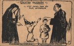 [CP anticléricale de la revue l’Idée Libre de Lorulot. Dessin montrant les méthodes expéditives de l’éducation religieuse.]