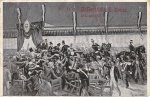 [CP publicitaire allemande (grand format) représentant une file d’attente devant le palais de justice de Paris lors du procès des survivants de la Bande à Bonnot (du 3 au 27 février 1913).