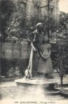 [CP vue de la statue de Louise Michel avec une élève et un chat à ses pieds, sculpture d’Emile Derré placée dans le parc le la Mairie de Levallois-Perret (Hauts-de-Seine). A noter la présence d’un gerbe de fleurs dans les bras de Louise Michel (Image tronquée dans le bas).]