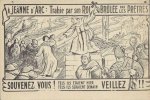 A JEANNNE D’ARC : Trahie par son ROI - BRÛLÉE PAR LES PRÊTRES SOUVENEZ - VOUS ! TELS ILS ÉTAIENT HIER TELS ILS SERAIENT DEMAIN VEUILLEZ ! verso : Cartes postales illustrées : 1fr. 50 la douzaine A La Calotte, Herblay (Seine-et-Oise)