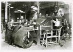 [CP photo espagnole, série de la CNT, durant la guerre d’Espagne, en 1936. Ouvriers en train de travailler au blindage d’une voiture dans l’entreprise Hispano-Suiza, collectivisée.]