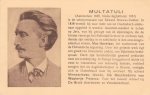 [CP belge en langue flamande, portrait de Multatuli nom de plume d’Edouard Douwes Dekker (1820-1887), et courte biographie de ce célèbre écrivain neerlandais, auteur du roman anticolonialiste "Max Havelaar" inspiré de sa propre expérience à Java.]