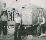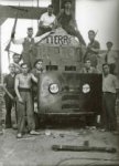 [CP photo espagnole de 1936, vue d’un groupe de travailleurs au près d’un camion blindé à destination de Saragosse et portant diverses inscriptions.]