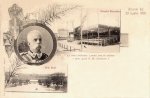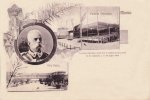 [CP italienne, souvenir de la mort d’Humbert 1er, tué par Gaetano Bresci le 29 juillet 1900 à Monza. Vue du gymnase, lieu de l’attentat, de la villa royale où le roi est mort, et de la chapelle expiatoire. Le roi en médaillon. ]