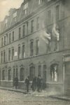 [CP anglaise du siège d’une maison occupée par des illégalistes anarchistes lettons dans le quartier de Stepney (East End), à Londres, le 3 janvier 1911. "Le Siège de l’East End" : Le feu à leur étage.]