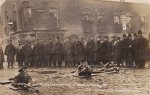 [CP anglaise du siège d’une maison occupée par des illégalistes anarchistes lettons dans le quartier de Stepney (East End), à Londres, le 3 janvier 1911. "Le Siège de l’East End" : après la bataille, les pompiers éteignant les flammes.]