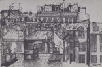 [CP des Éditons de Quat’Sous. Dessin de Marie Paule Lebris. Vue des toits.]