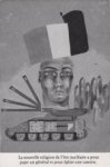 [CP antimilitariste des "Éditions de Quat’sous". Dessin de M. P. Lebris : visage, drapeau, char d’assaut, horloge et stock de bombes.]