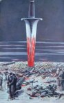 [CP suisse. Reproduction d’un tableau de Firmin Sagristà dénonçant les horreurs de la guerre. Illustration poignard ensanglanté planté dans un monceau de cadavres, quelques survivants contraint à la misère. ]