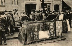 [CP portugaise, buste de Francisco Ferrer par le sculpteur français Emile Derré. Ferrer au moment de son exécution, soutenu par sa fille Trinidad.